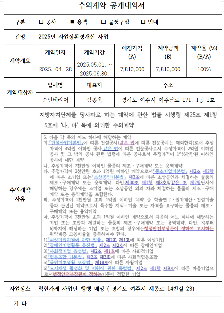수의계약 공개내역서 착한가게사업단 뱅뱅매장.hwp